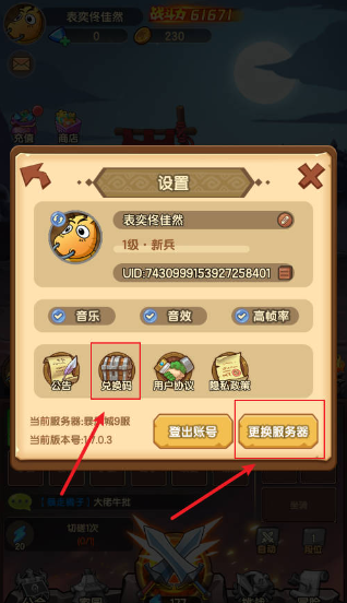 4、点击左上角的角色头像,可以方便地更换服务器,或输入兑换码领取奖励。