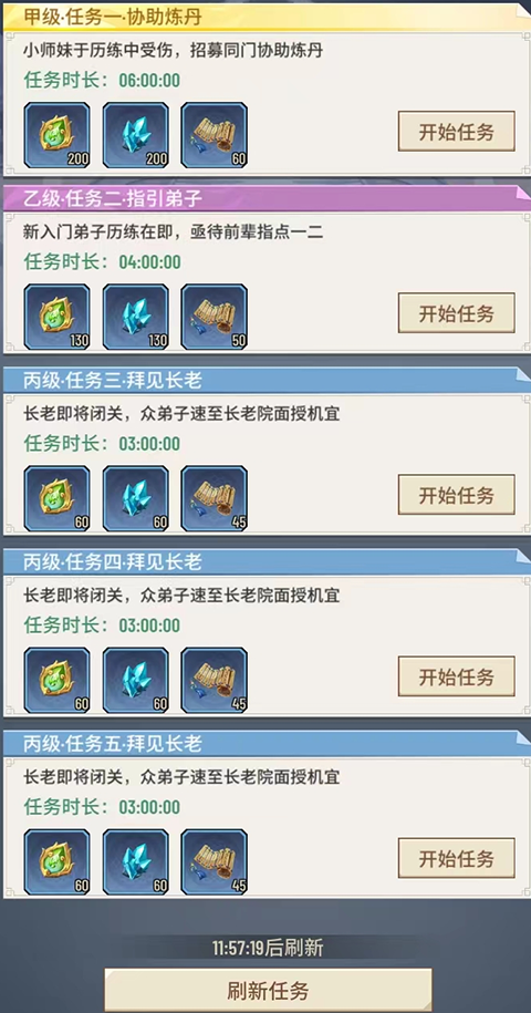 在宗门大殿的右方,是宗门任务领取处,在这里,玩家们可以接受各种各样的宗门任务,不同的任务拥有不同的时长和不同等级的奖励,如果对当前任务不满意,也可以通过刷新来获取高级任务。