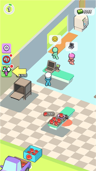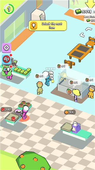 玩法也十分的简单,开局需要购买桌椅,然后还要搞个柜子以及厨房进行烹饪美食,接着有顾客进入用餐,需要快速出餐,同时也要快速收拾餐盘,然后放入洗碗机,等待顾客吃完之后便可进行收银,然后就可以获得钞票,有了钞票之后便可雇佣员工以及升级,还可以购买其他道具。