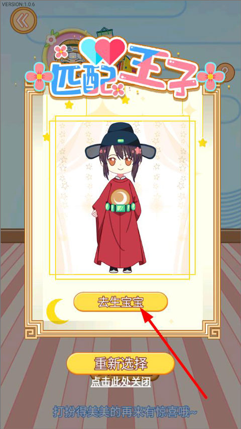 3、生宝宝需要匹配王子,随机选择一位王子和玩家体验生宝宝,王子选择好之后点击去生宝宝;玩家想要生五一宝宝,需要穿戴花开边头饰和长裙才可以。