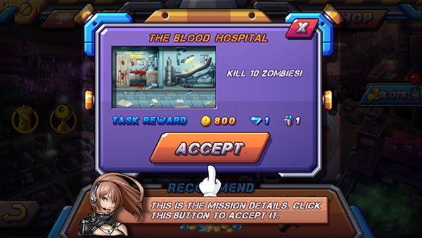 2、进入后会有一个简单的指引,点击“accept”进入第一关“血色医院”。