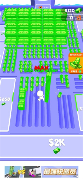 游戏的画面是3D风格的火柴人造型,虽然看起来和其他农场游戏差不多,但玩法上却很有新意。一开始你只有一小块土地,慢慢种植钞票,看着农场里全是钱的感觉真的很有成就感。游戏中还提供了很多道具,比如平衡车和吸铁石,可以用来加速种钱的速度或者快速收集钞票。