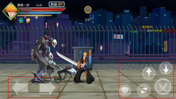 2、进入关卡后,左侧按钮控制人物闪避和移动,右侧按钮控制人物释放技能和防御等。