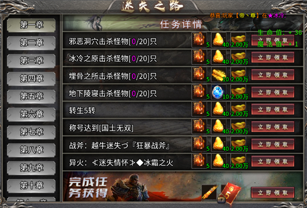 7、点击任务可查看当前任务的击败数量,完成后即可领取后面的奖励
