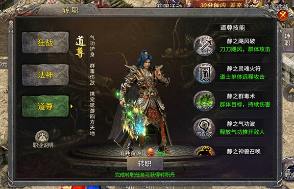 战斗技巧:道尊拥有噬血术,能恢复自己的生命,召唤强化可极大提升战宠战斗力,无极真气可提升自身爆发。