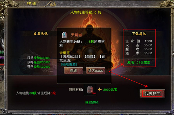 玩家使用天精岩和元宝即可进行转生,转生成功可以大幅提高角色属性,增加战力。