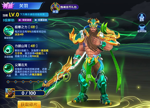 典藏级别炮魂,需要100个关羽碎片解锁,以冰冻技能为主,升阶可以解锁极寒之力、力拔山河、义薄云天三大技能,轻松捕捉巨型鱼类BOSS。