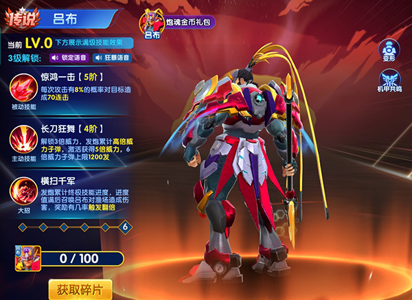 需要100个吕布碎片解锁,以炮台连击为主,升阶可以解锁惊鸿一击、长刀狂舞、横扫千军三大技能,造成大幅伤害,快速捕鱼。