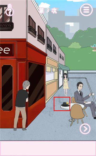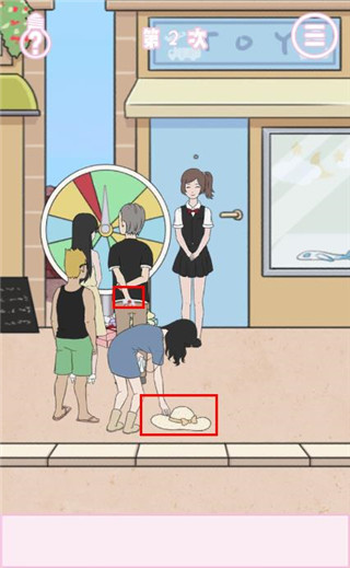 第2关:点击女生帽子,当女生弯腰捡帽子的时,拿走男主手里的遥控器,点击转盘。