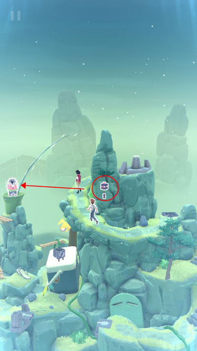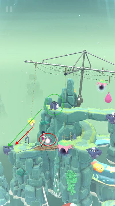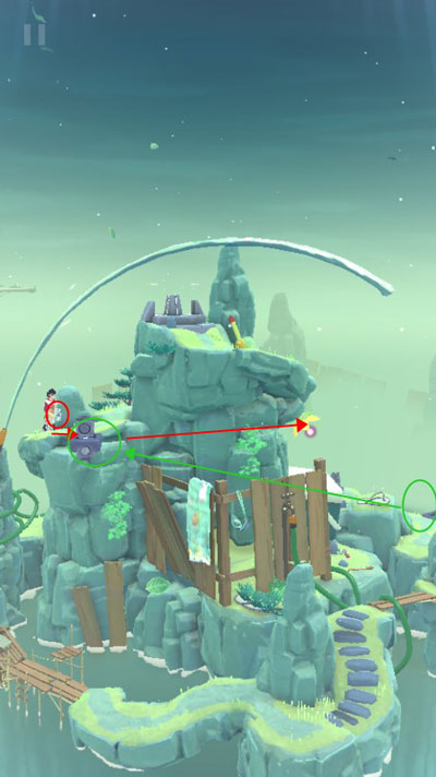 21、重新点亮的【提灯】可以驱散登顶前的迷雾,但我们先不着急拿走木梯上的【提灯】,继续让F把木梯升到被迷雾缠绕的【风铃】位置,然后让主角们前进,使得F拉动【风铃】激活对应砖头上的【黑莲花】。