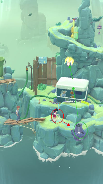 20.在走到图中位置的时候,让F控制这【第二个沙漏】,让木梯升往他们这个位置的木桥平行位置,让A把【提灯】放在木梯的【灯座】上,用前面的方法再次把【提灯】点亮。再让F升上来。