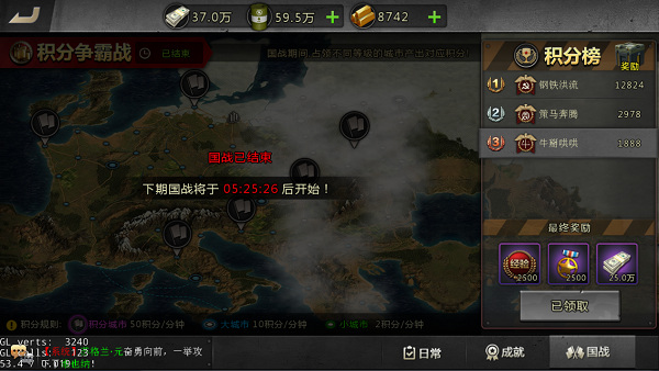 开启城战后,每天有两次国战可参与,分别是中午12:30和晚上20:30,各持续1小时,均可获得大量经验,花点时间争抢名次,经验获得会翻倍哦!