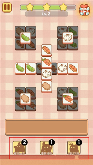 游戏采用清新治愈的卡通漫画风格,温馨的画面和经典的三消玩法让人倍感亲切。底部设有7个槽位,点击图标即可将方块放置在槽位上。当3个相同图案的方块位于底部槽位时即可消除,但注意总块数不能超过七格,否则游戏失败。