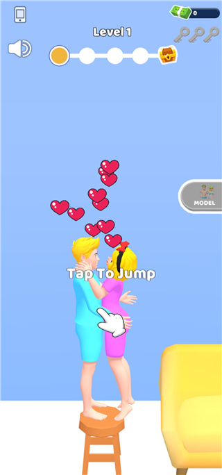 要注意,情侣落地并不代表游戏结束,落地以后迅速的再次点击屏幕,他们会再次进行翻转,玩家连续点击的速度决定了情侣在空中翻转的高度。在游戏过程中还会有一些道具,这些游戏道具有的能够提高你的分数,有的则能够帮助你在后续的关卡中顺利通关,收集这些道具的前提依然是避免头触碰到地板。