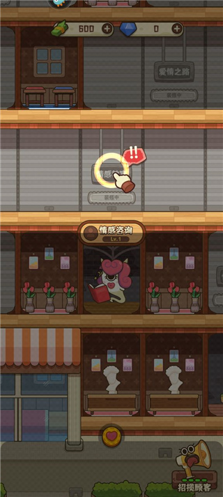 恋爱日记手游是一款趣味横生的模拟爱情为主题的培养手游。平常的你想必都是在被催婚吧,这回在恋爱日记游戏中终于轮到你来当媒人了。为了大力发展村里的婚恋事业,拯救魔幻村的人口大危机,你受到村长的委托开设了一家相亲公司。如果你是新手玩家,刚进入游戏会有村长的引导,要想开公司肯定要有本钱,所以村长做出了牺牲,伟大的把自己的私房钱贡献了出来。前期经营需要将整栋大楼都进行基础的布置,不同的楼层房间和设施都有着不同的作用,都需要玩家利用村长的私房钱来建造。通常最开始都是建造一个吸引客户的前台,方便客户在前台登记前往下一楼层的咨询台咨询自己在恋爱过程中遇到的问题。最重要的就是匹配顾客的情感教室,配对是恋爱日记游戏里面最关键的一个环节,玩家需要在客户的进度条结束之前配对成功,配对成功之后会获得相应的资金。有了足够的资金要记得及时的升级公司设施和公司员工哦,工作的效率也会更加的高效。欢迎感兴趣的朋友在本站点击下载体验。