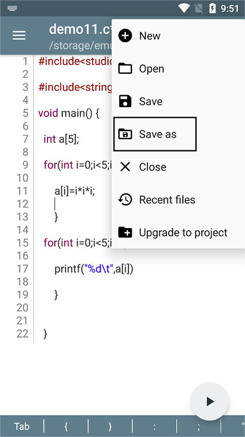 2、将需要运行代码输入,点击文件夹标识,选择“Save as”,给c文件命名并保存,注意文件的后缀填写。