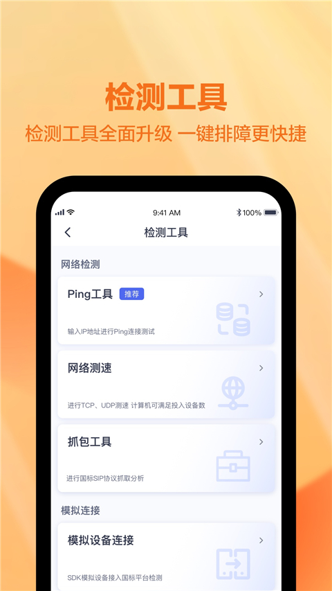 天翼视联装维端app是基于中国电信天翼视联集约运营平台能力打造的装维工具,是面向装维人员提供设备统一安装入口,支撑装维人员快速替用户绑定摄像头、NVR、AI盒子、IOT、一体机等设备,并提供检测工具、AI交付、云存套餐交付、级联交付等场景应用。