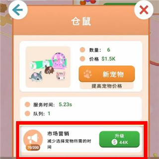 2、在“仓鼠”建筑内,点击“市场营销”右侧的“升级”按钮