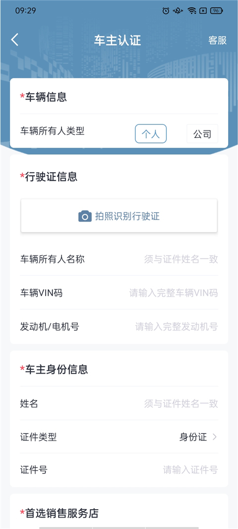 车主首次使用APP功能,提交实名认证信息,进入实名页面,系统会自动填写姓名、身份证号、车架号信息,用户 需要上传身份证相关信息提交至联通公司完成实名认证审核。