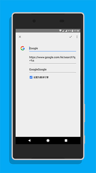 除了简单地查询单词外,如果你的手机中下载了 Google Translate,搜索 Lite 还可以配合 Translate 进行查询。具体方法是在侧栏中长按默认的 「Google」 搜索引擎进入设置界面(注意必须是修改默认的谷歌搜索引擎,自行添加没有效果),勾选「设置为翻译引擎」即可,如果不小心改错,将搜索引擎按照下图内容填写即可: