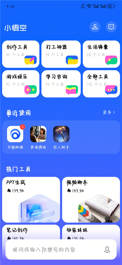 小悟空ai智能工具即小悟空App,是抖音集团旗下的AI产品,是基于大语言模型创建的AI工具合集。软件中提供了上百个AI工具,主要包括创作工具、打工神器、生活锦囊、游戏娱乐、学习资讯5大板块,主要帮助用户在创作生成、学习提升等工作、学习方面提高效率。