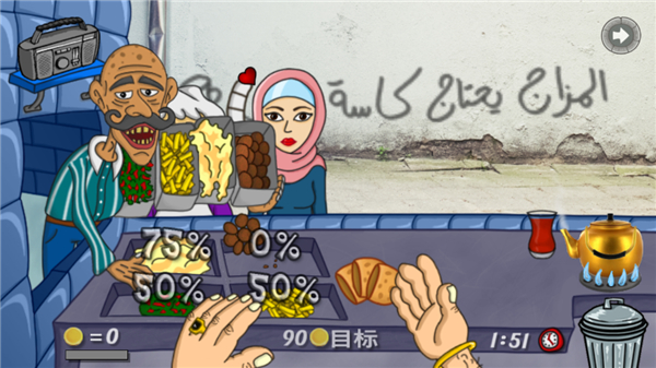 6、法拉费之王游戏中不需要烹饪,放置好了配菜点击顾客即可给它,饮料需要拉动给,并获得金币,直到时间结束,如果未达到目标金币无法前往下一关