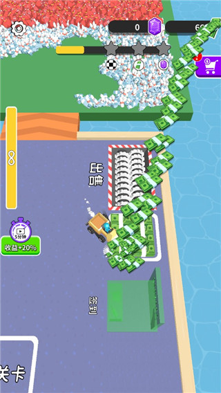 步步小富翁游戏玩法十分简单,在这里玩家需要进入游戏,然后开车去收集物品,可以选择扫地机、卡车、运货车等进行游戏,然后还可以对其数量、范围等进行升级,可以帮助玩家更好的进行游戏。然后将自己收集好了的物品进行出售,出售完成之后就可以获得钞票,当完成任务之后就可以解锁下一关卡。