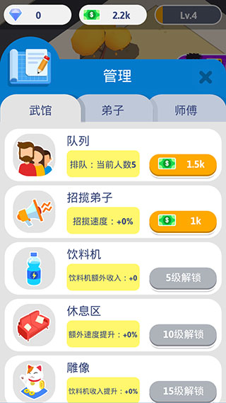 5、进入管理界面,我们还能升级武馆的各项属性,如队列、招揽弟子、饮料机、休息区等。