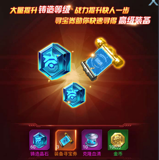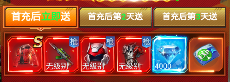 另外首充还有3个无级别限制的高级红色装备,游戏内前期装备分为蓝、紫、橙、红、粉五个阶级,红装在前期加战力特别可观,到你打造出对应部位的粉装前都可以使用,所以能拿就拿下。