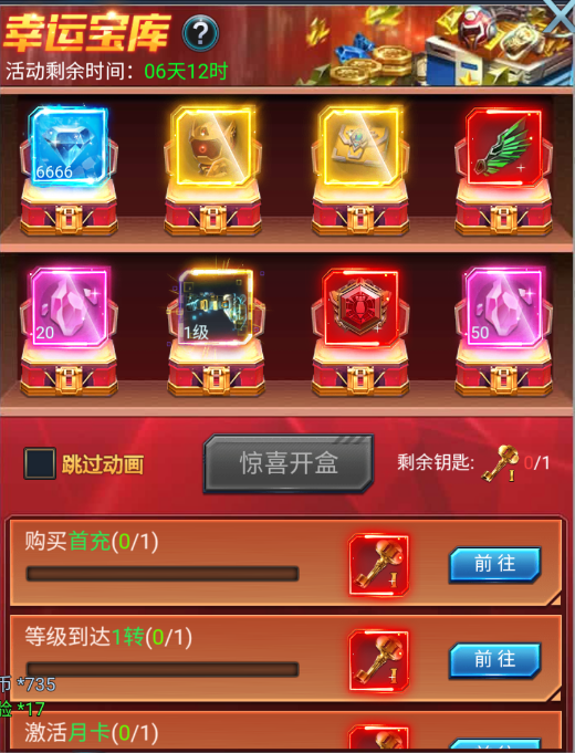 第二个,幸运宝库:里面的每一个奖励都是前期提升巨大的物品,只需完成任务,就可以随机获得宝库内任意一件奖励,你心动吗,我反正很心动!