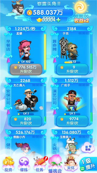 1、修炼和关怀换成长,神仙也能来帮你打工,增加游戏更多收益。