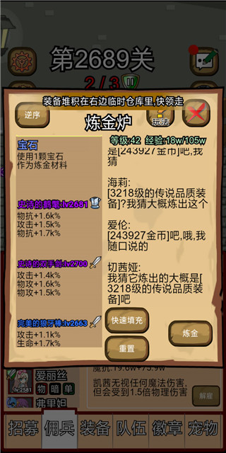 装备:基本靠炼金,最好就是刷宠物顺便刷炼金,不然层数太高装备买不起。两个同等级和两个低一等级的可以合成高一级装备,四个相同位置的装备可以合成同一种装备,不同种装备炼金出的种类随机,似乎饰品类概率最好,补给类似乎概率为零,所以补给类只能四个补给类合成