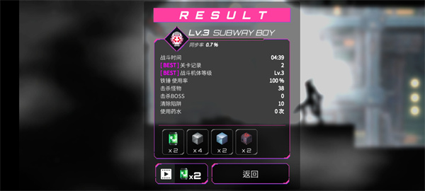机战地城游戏操作简单,游戏中玩家点击关卡角色会自动走到门前,走进门即可开始闯关,玩家需要通过摇杆来进行移动,遇到一些障碍还可以点击跳跃键来越过障碍,玩家还可以点击跳跃再点击冲刺来完成远距离跳跃。当玩家遇到怪物时,玩家可以点击攻击键来进行攻击,击败后还会获得经验,升级后还可以在三个能力中选择一个来提升实力,将所有的怪物击败后即可通过,通过后游戏会根据玩家游玩情况来发放奖励。