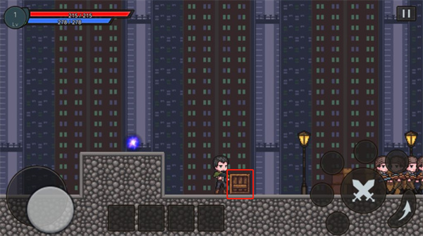 无路可退游戏中有许多的箱子,在前进的道路上会阻挡角色前进,玩家可以点击攻击按键将箱子破坏掉,破坏箱子会随机获得道具,箱子不多还可以点击右下角最角落的按键进行跳跃,按键可以连续点击两下进行二段跳。