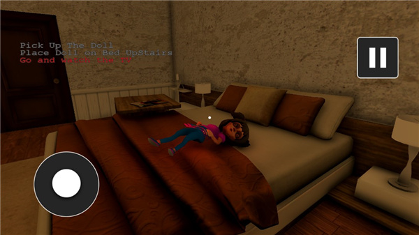 可怕的鬼娃娃屋手机版(Scary Haunted Doll House)是一款恐怖题材的冒险闯关游戏。游戏采用的是第一人称视角,让玩家拥有超强的代入感,让你能够真正的感受到被黑暗和未知的恐惧给你带来的感觉。新手玩家刚进入可怕的鬼娃娃屋游戏前几晚都是会有提示的,你只需根据地面上的脚印前进就可以,将屏幕中心的圆点对准物体就可以捡起或者开关,左下角是控制玩家移动的摇杆,左上角则是系统给大家的任务,每完成一个任务就会显示下一个任务。你需要根据游戏给出的线索迅速解谜,从而顺利平安的渡过今天晚上。小编亲测,前几夜的任务都是比较简单的,玩家只需要找到鬼娃娃,将她放回二楼卧室的床上,然后前往客厅看电视就成功渡过一晚了。越到后面可怕的鬼娃娃屋游戏最新版的关卡就越难,娃娃会藏在你意想不到的地方,每次关卡结束你看到的电视画面很有可能就是她最终的样子。快来试试看你能在这里熬过几个夜晚吧。