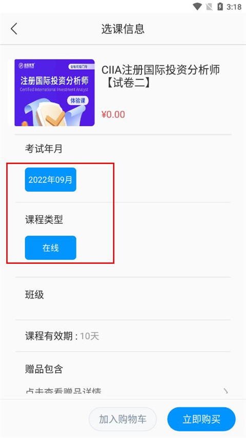 5、在这里选择考试年月、课程类型后找到并点击“立即购买”按键;
