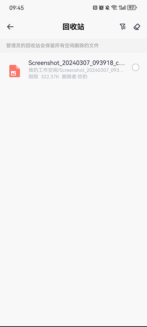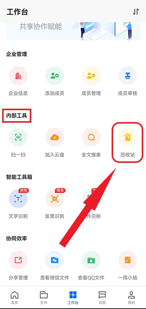 超级管理员的回收站会保留所有空间内被删除的文件,可以直接在工作台的内部工具模块,选择回收站。