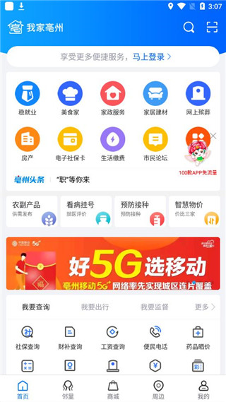 4、“我家亳州”共开发了查询缴费、交通出行、居家生活、医疗保健、新闻综合等7个一级栏目,一级栏目下共设24个二级栏目,为用户的生活带来了极大的便利