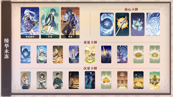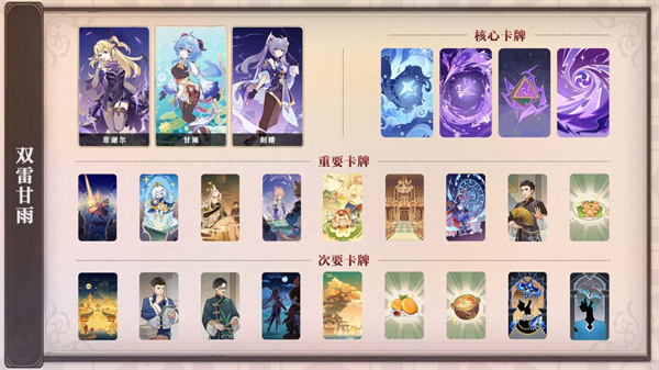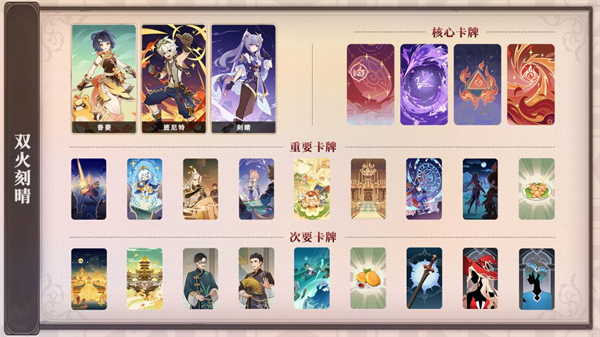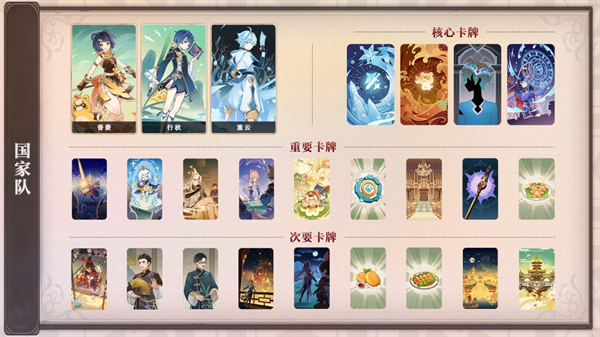 (2)队伍中一般放两个核心,注意不是输出,而是核心(也就是队内地位),以两个角色为核心构筑卡组目的就是防止卡牌太过杂乱,难以抽到核心角色所需的卡牌