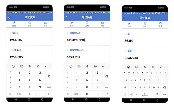 在单位换算工具中,主要包括了距离单位换算、面积单位换算和角度单位换算等。