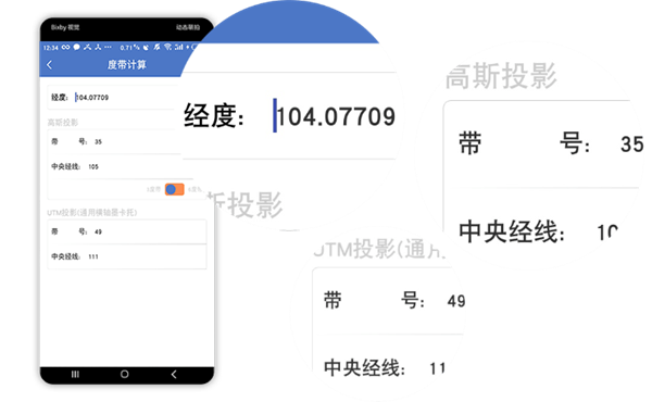 在度带计算工具中,可以通过输入经度值,自动计算出高斯投影带与UTM投影(通用墨卡托)的带号和中央经线等。