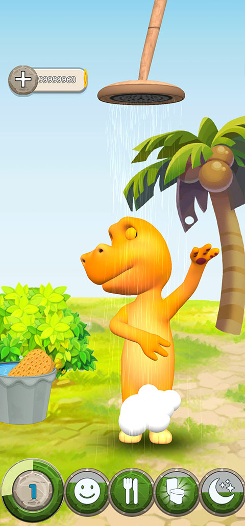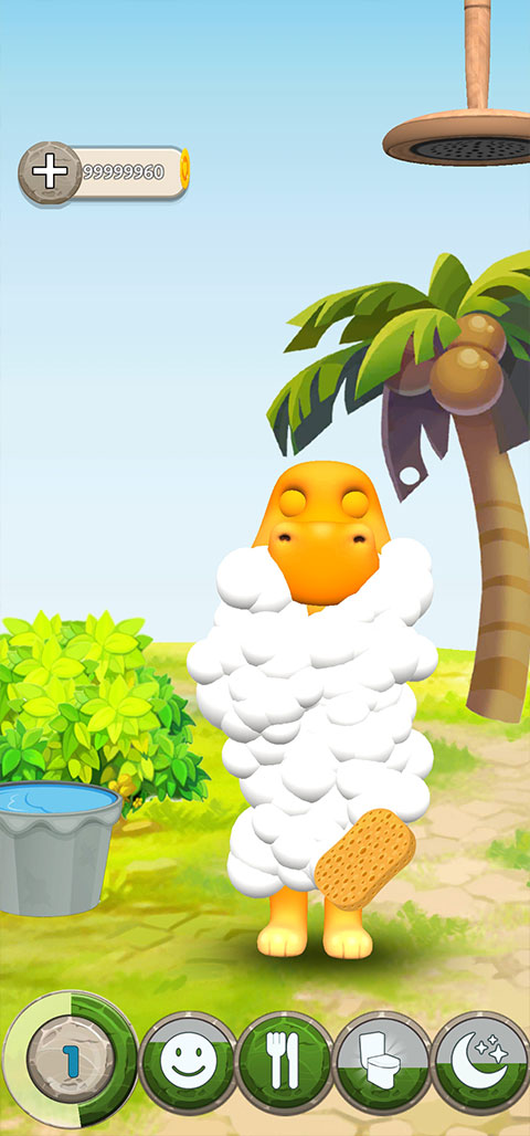 1、吃饱了接下来进入清洁阶段,拿起海绵点击小恐龙身体就可以搓澡。