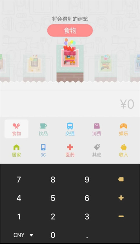 1、在本站免费下载记账城市APP,就可以打开软件啦,点击进入开始记账,这里有许多的支出条目,有效避免了你记录支出来由的麻烦,只需要简单分个类就可以了,这对于每一种可能的支出,比如食物、饮品、交通等等都有着与之对应的建筑。
