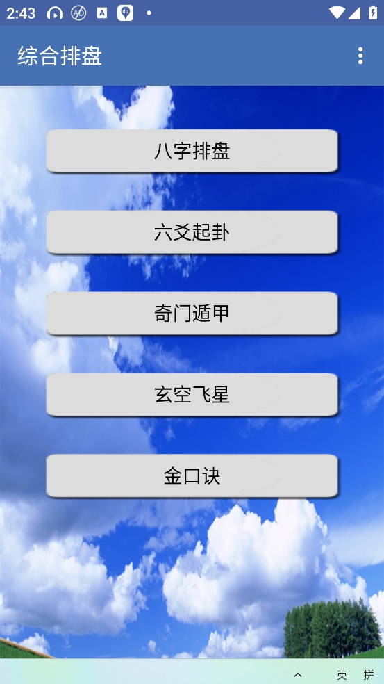 综合排盘App是一款多功能排盘算卦手机工具,它在提供八字排盘、六爻起卦、玄空风水、六壬金口诀、奇门遁甲等算卦功能的同时,还准备了专业全面的命理预测和风水分析服务,可满足用户多样化算卦需求!