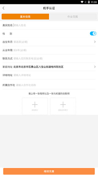 5、信息认证包括【基本信息】和【作业范围】两大块,完成后即可成功注册农机手。