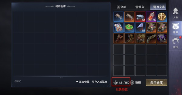 背包最下方是包裹可用格数。如果物品过多,点击仓库可以初始存放150格的物品。