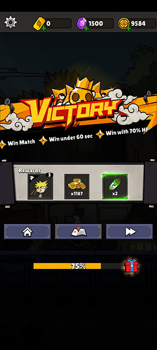 6、利用火柴人忍者的敏捷动作开始战斗吧,获得胜利会有相应的关卡奖励,房子按钮回到首页,地图按钮选择关卡,最右侧的按钮点击可以直接进入下一关。