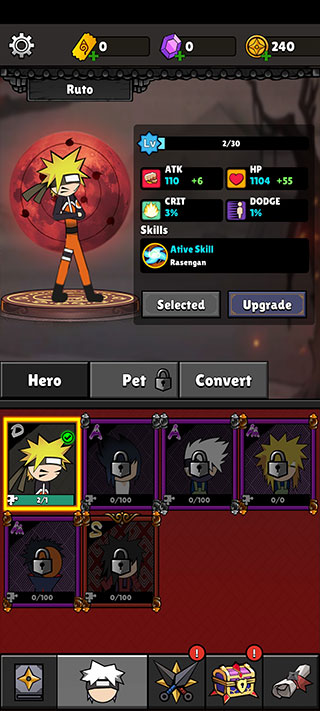7、回到首页后,点击底部头像进入角色页面,上方【Upgrade】可以对角色进行升级,底部可以选择喜欢的忍者英雄和宠物技能。