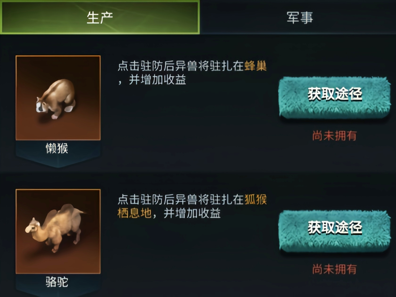 发展型异兽主要驻扎在领地从事生产、管理等内政建设。可以通过发展异兽栖息地建筑进行“驻扎”,驻扎之后会大大加速资源、部队的生产,其效果也是由该异兽的技能决定的。
