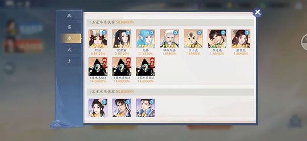 附上一张水系稀有度图片,前三个是相对稀有的,但是龙葵的技能不是冰冻,虽然强力但是跟其他侠客不是很搭,所以这里未做推荐,后四个获得难度适中,至于三个紫色则只有雷元戈值得,大家可以根据自己抽到的卡来合理调配阵容,不用强行靠,星多也是战力的一部分。